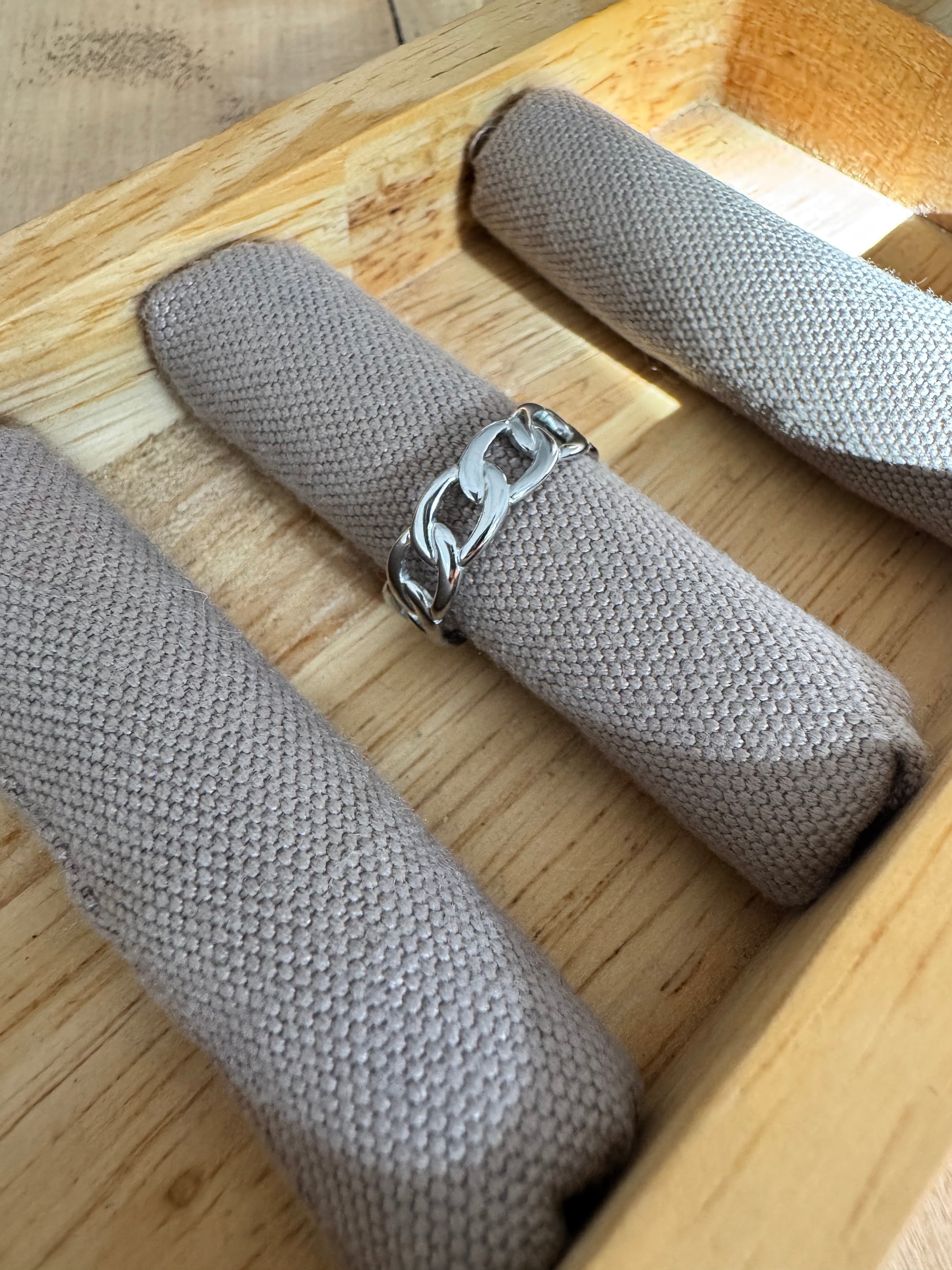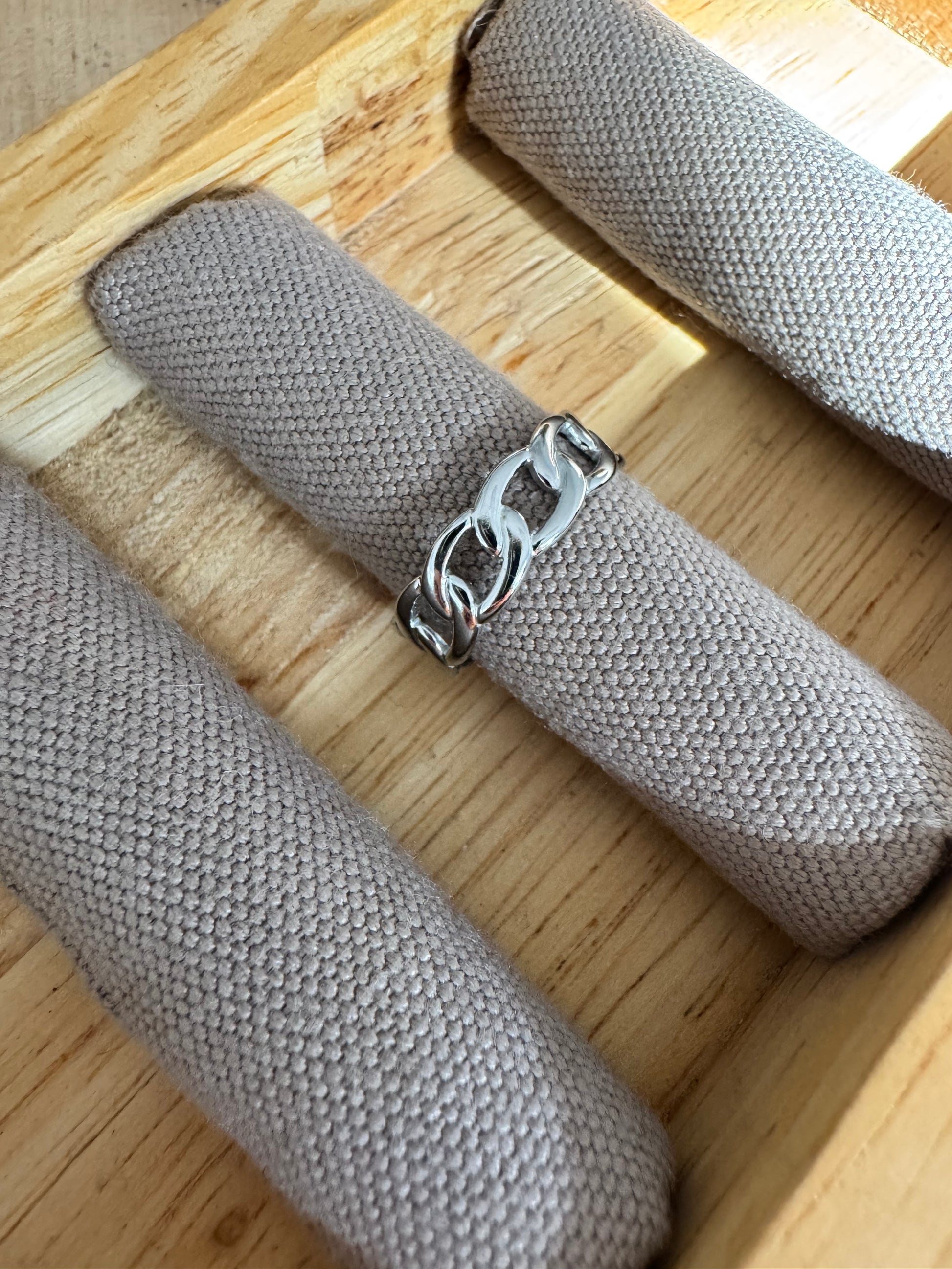 Pequeño pero con presencia, el anillo Eden está elaborado en acero inoxidable con acabado en color plata. Su diseño entrelazado, similar a una delicada cadena, combina volumen y sutileza, creando una pieza elegante y moderna que destaca por su original textura.