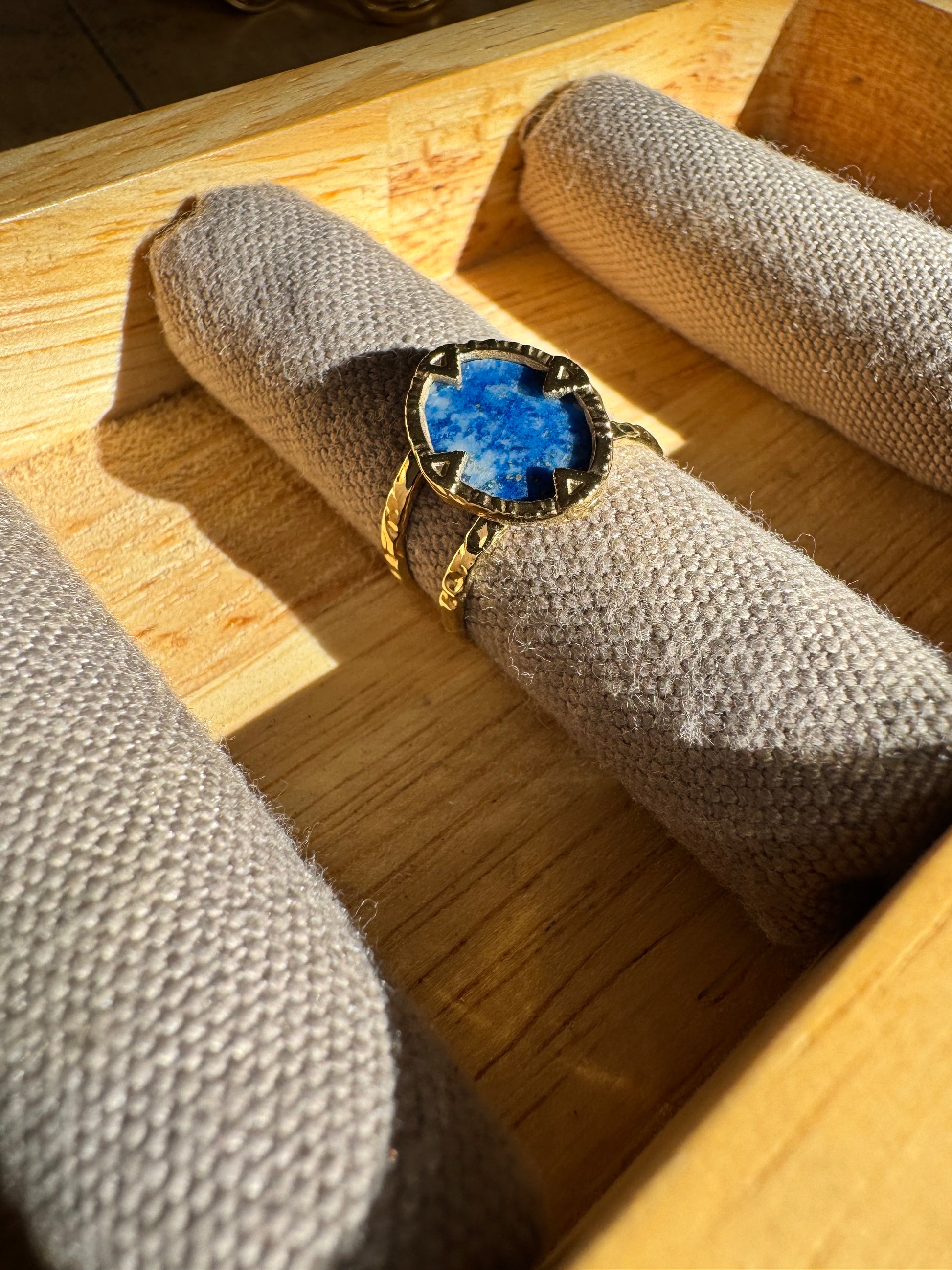 Refinado y equilibrado, el anillo Evara está confeccionado en acero inoxidable y destaca por su piedra central en un profundo tono azul. Su diseño combina fuerza y serenidad, creando una pieza elegante que atrae miradas sin perder su delicadeza.