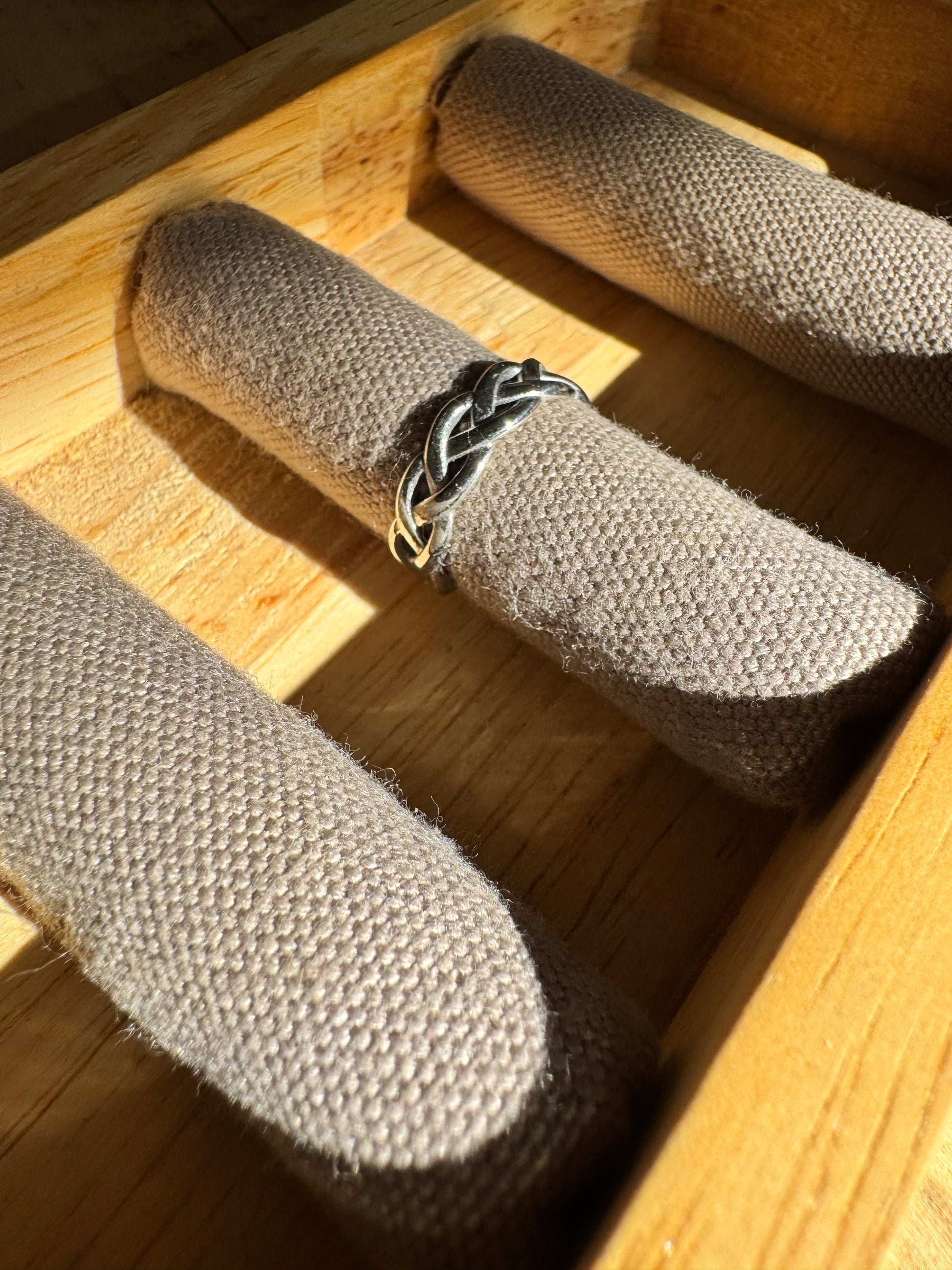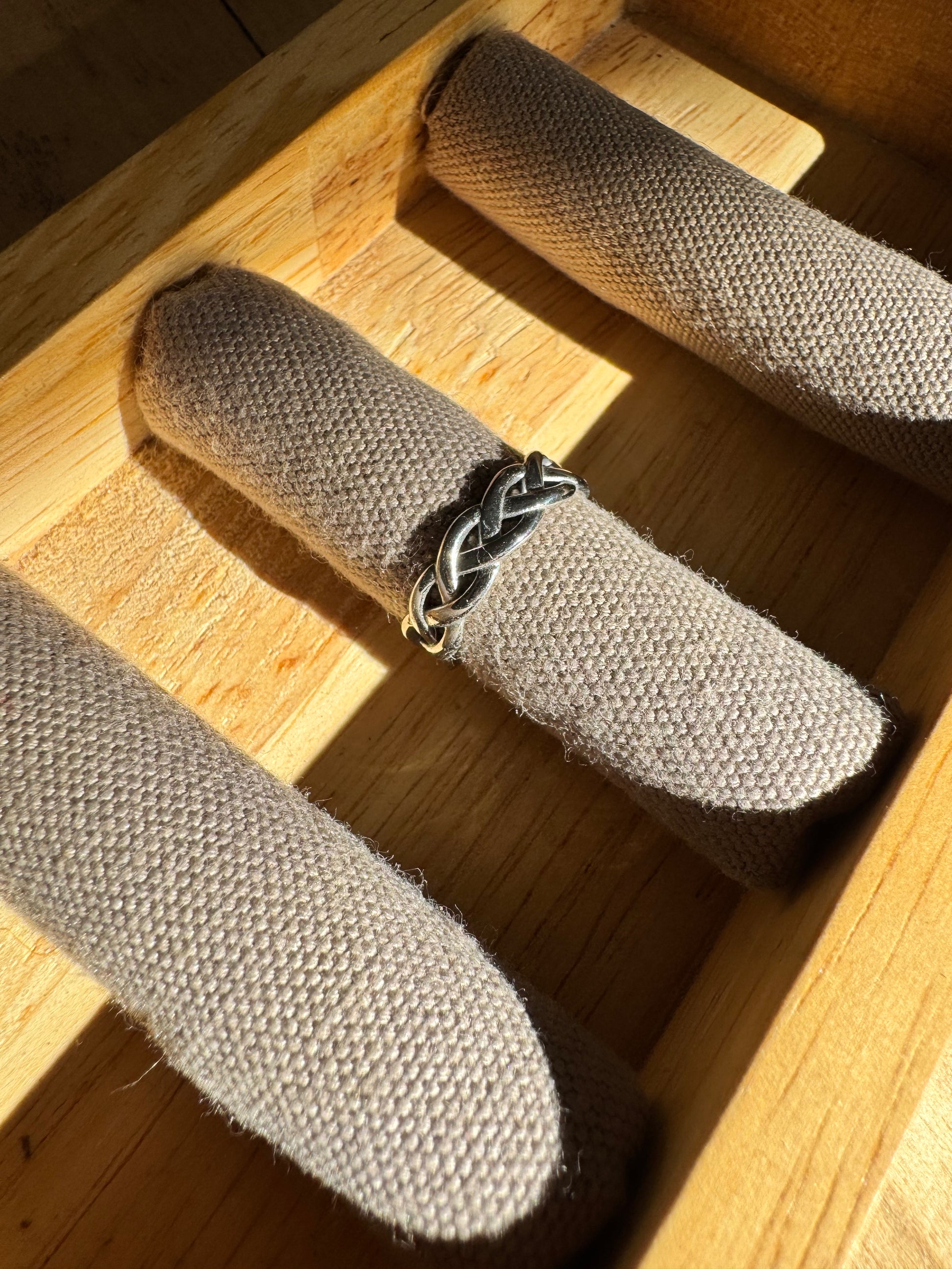 Delicado y con carácter artesanal, el anillo Fiamma está elaborado en acero inoxidable con acabado en color plata. Su diseño fino y trenzado evoca movimiento y armonía, convirtiéndolo en una pieza atemporal que combina simplicidad y elegancia en perfecta medida.