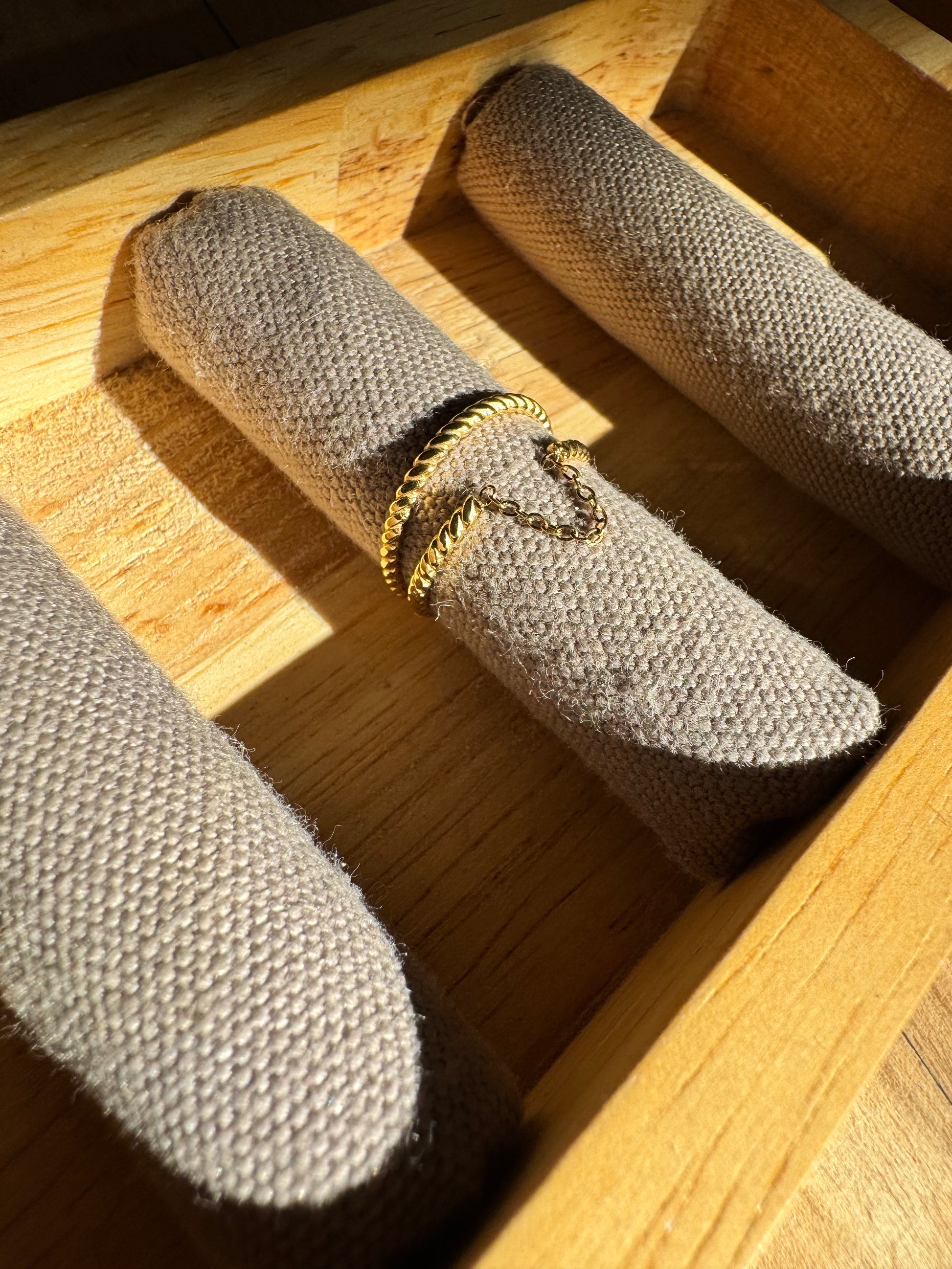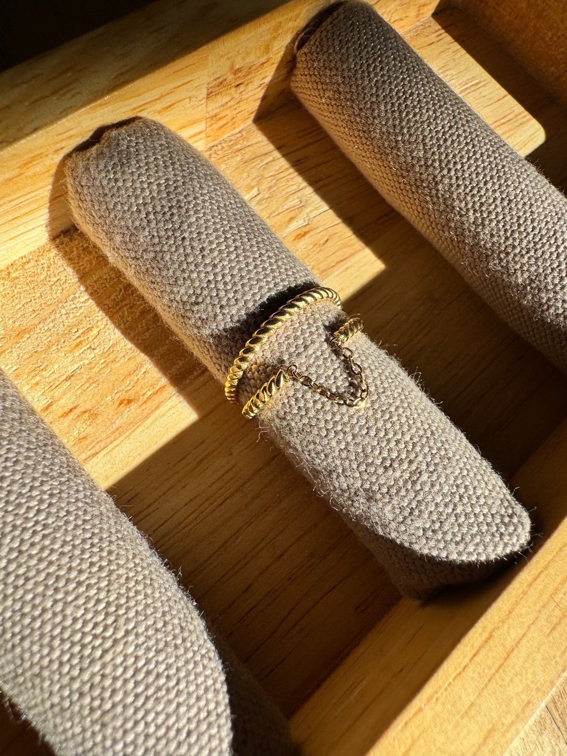 Original y moderno, el anillo Notte está elaborado en acero inoxidable con un elegante acabado dorado. Su diseño de doble línea se complementa con una pequeña cuerdecita colgante que aporta movimiento y un toque distintivo. Una pieza única que combina estilo y sutileza con un aire contemporáneo.